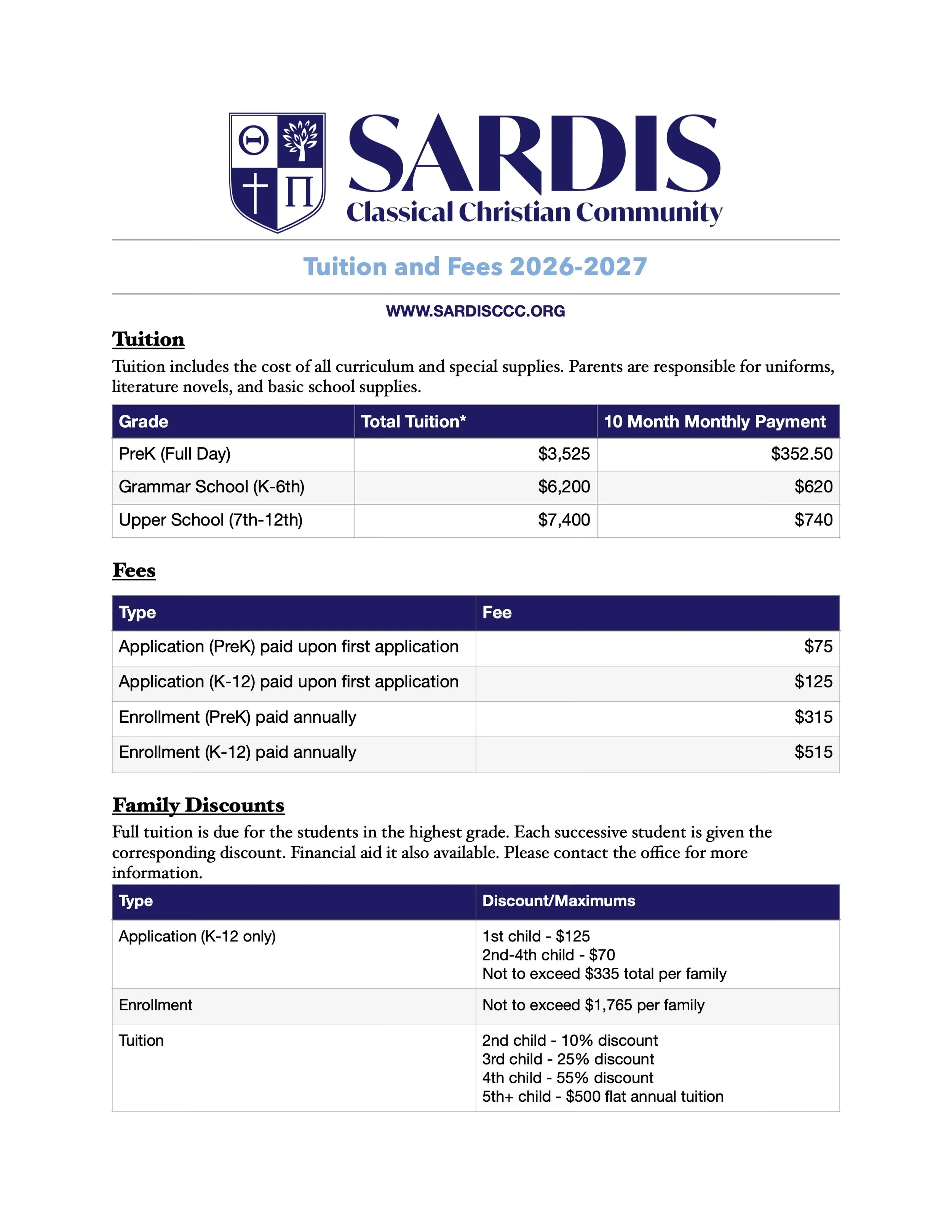 We are passionate about helping families and use the most effective model available to equip parents to prepare their students academically and emotionally. We understand that payment plans help fit tuition into your budget. To help families budget tuition into monthly expenses, we provide tuition for the year that can be paid in 10 monthly payments.